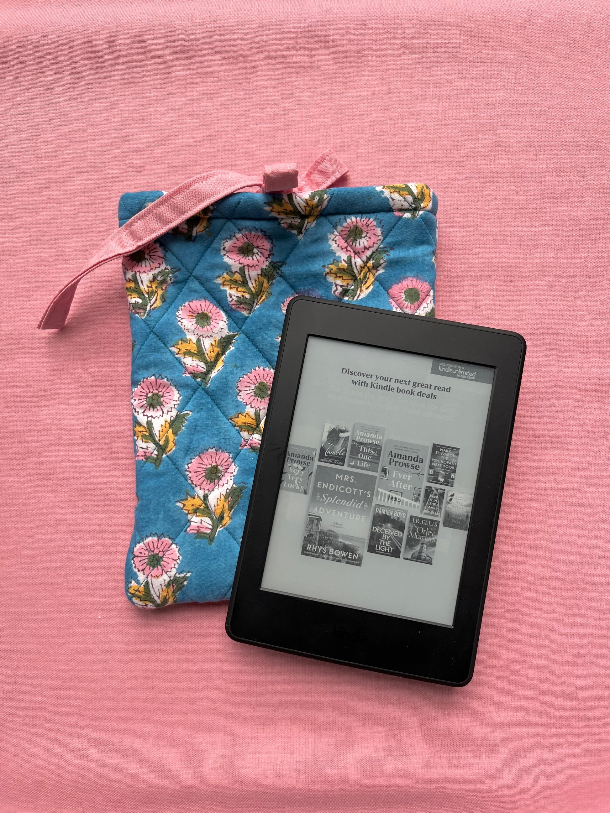 Handmade quilted kindle sleeve, made from a beautiful blue block print 100% cotton fabric. Lined with co-ordinating pink cotton fabric and matching tie closure.