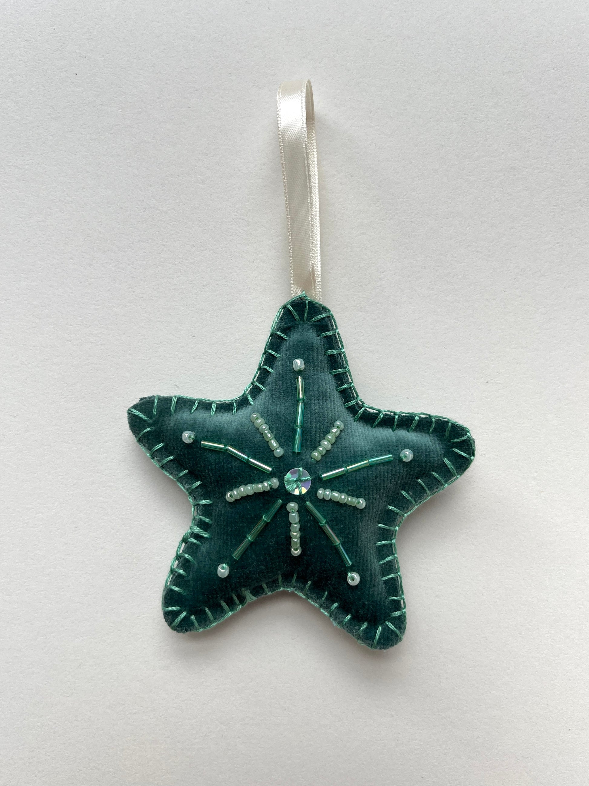 Hand embroidered and beaded velvet star decoration with ribbon hanging loop.