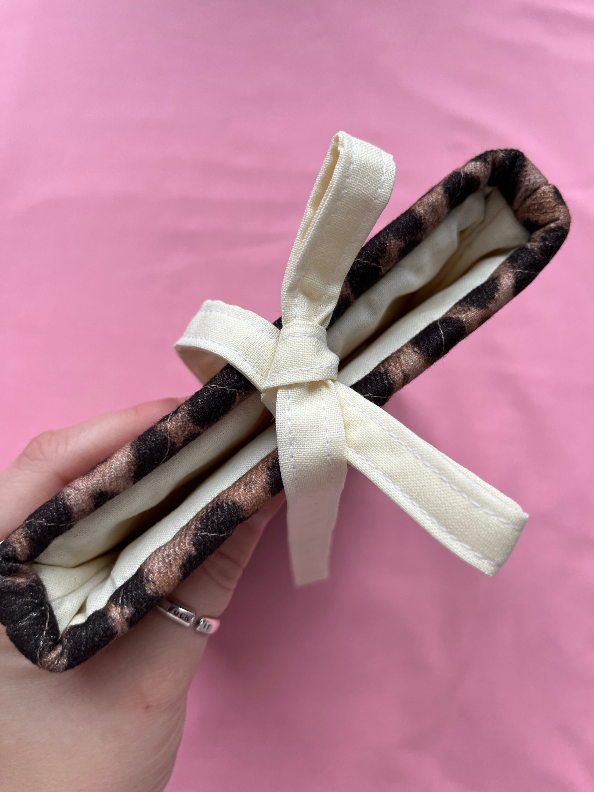 Handmade quilted kindle sleeve, made from a leopard print denim 100% cotton fabric. This is a complete one off item, made from the leftovers of a personal project. Lined with co-ordinating cream cotton fabric and matching tie closure.
