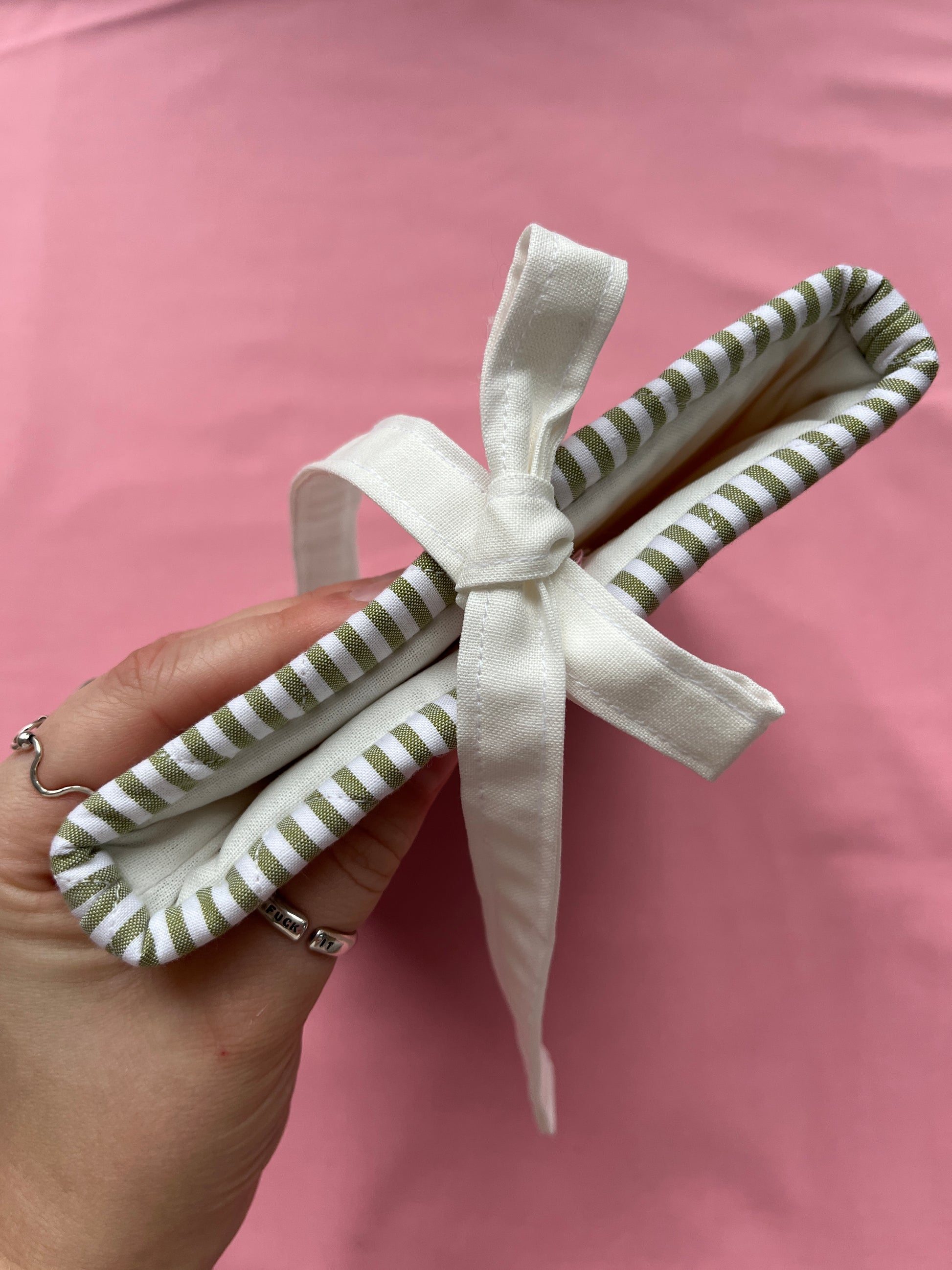Handmade quilted kindle sleeve, made from an olive stripy 100% cotton fabric. Lined with co-ordinating cream cotton fabric and matching tie closure.