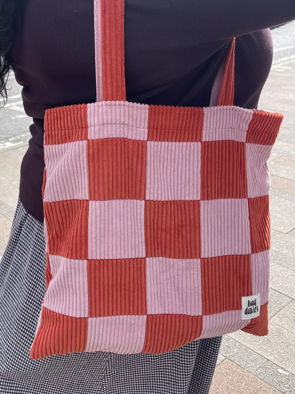 Each tote bag is handmade from 50 individual squares of beautifully soft cotton corduroy, patchworked together to create the unique checkerboard design.